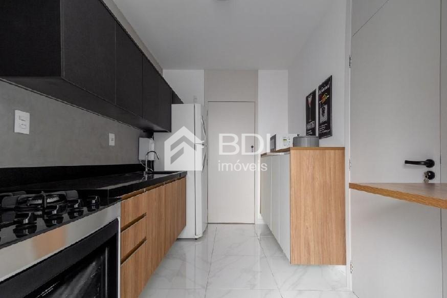 Cozinha planejada com muitos armários e toda equipada com fogão, geladeira, micro-ondas, filtro