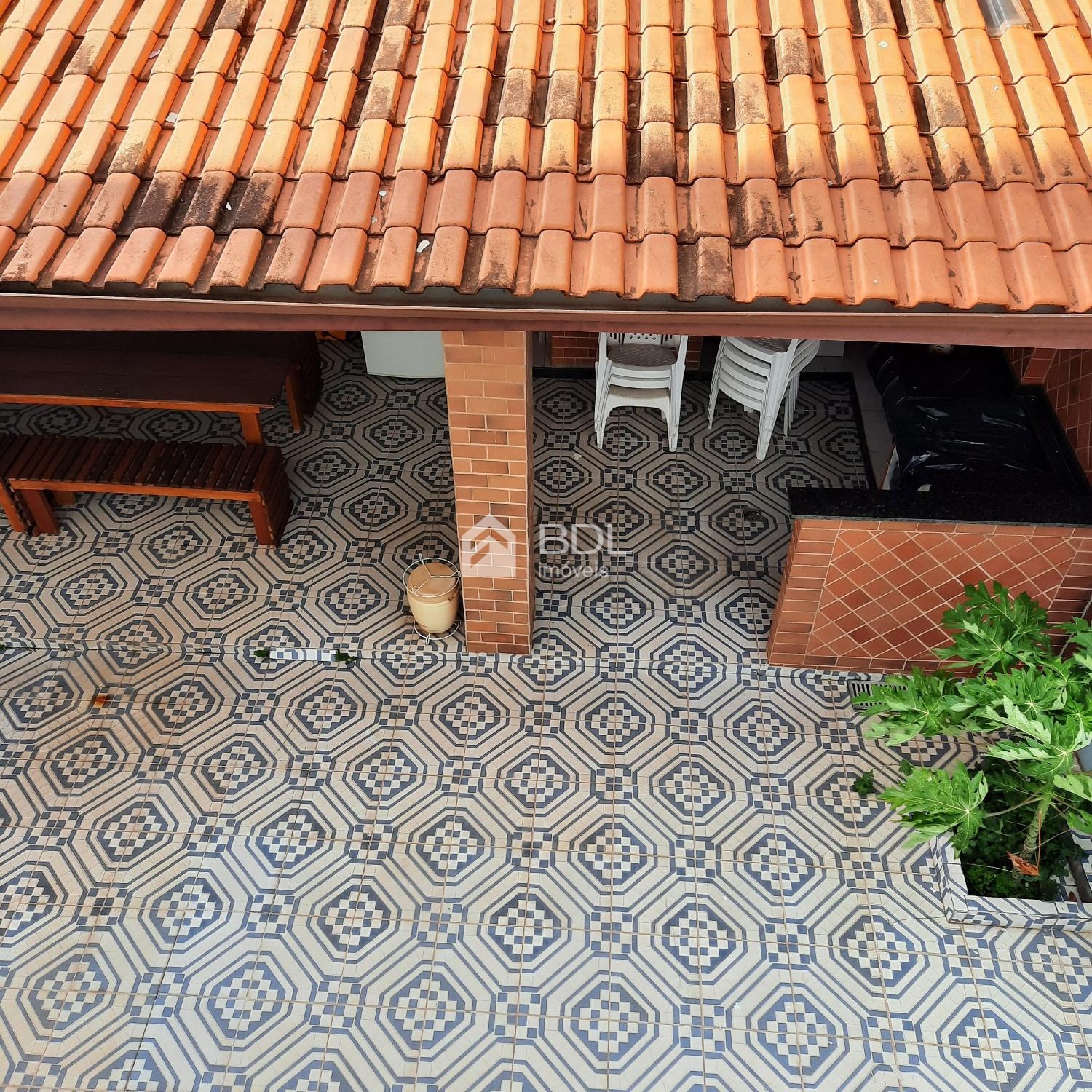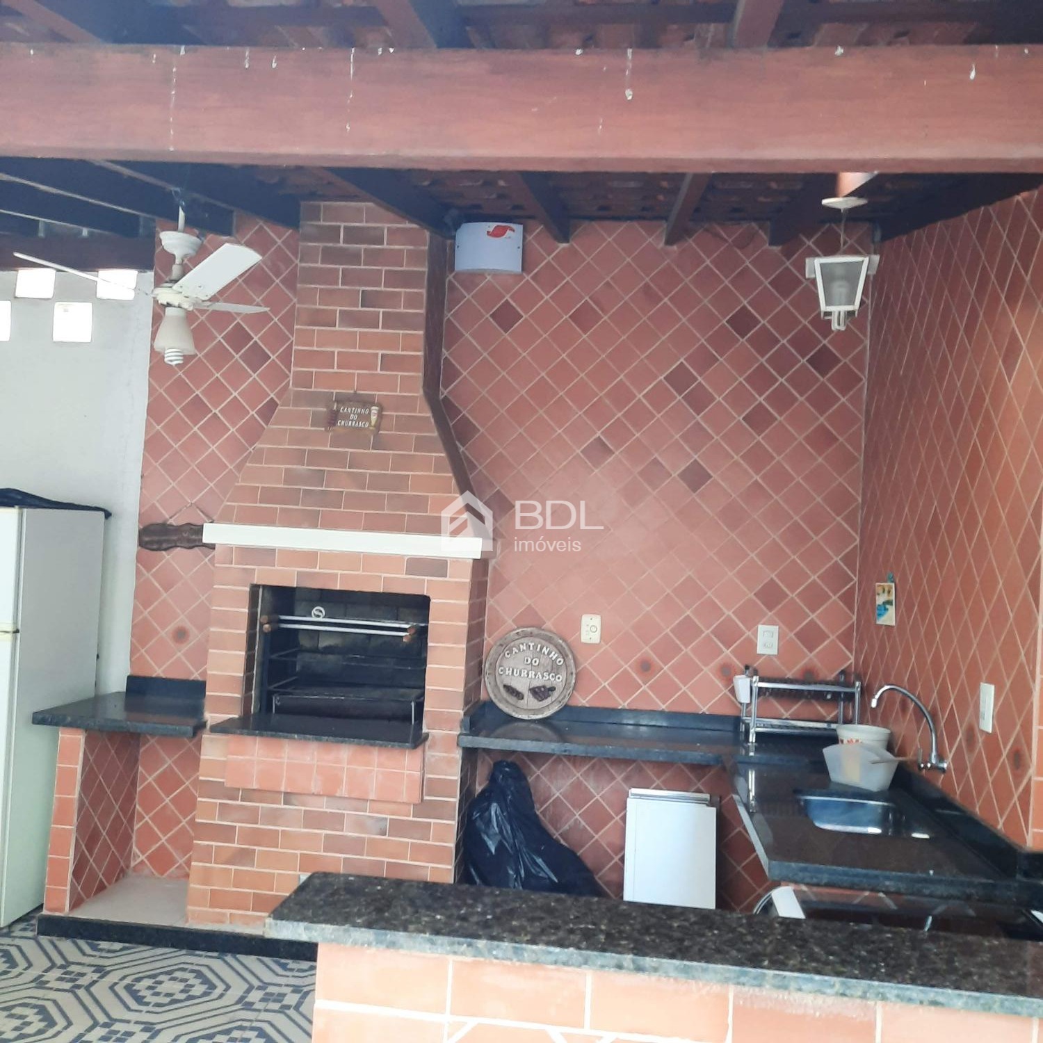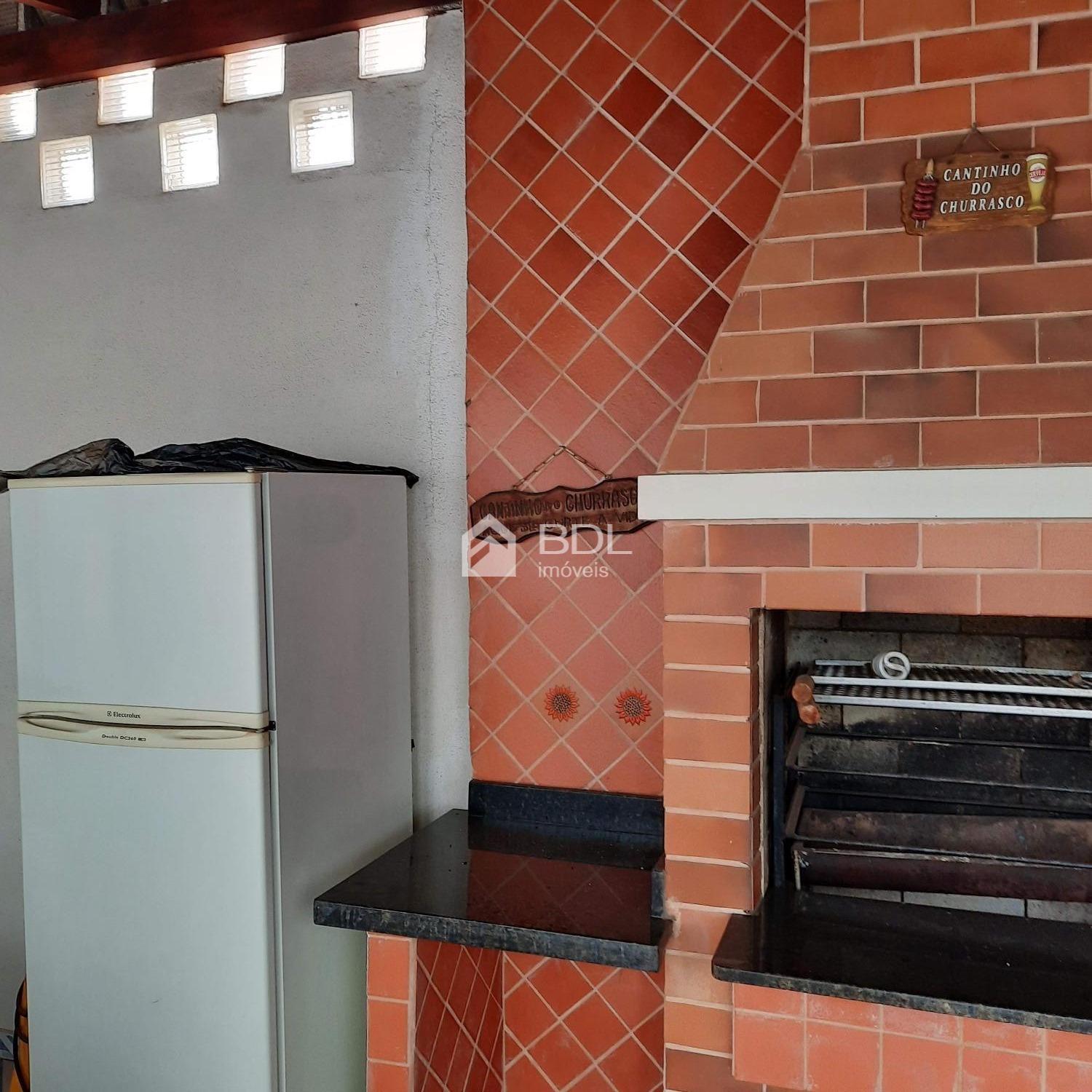 Espaço gourmet com churrasqueira e um quarto de despejo