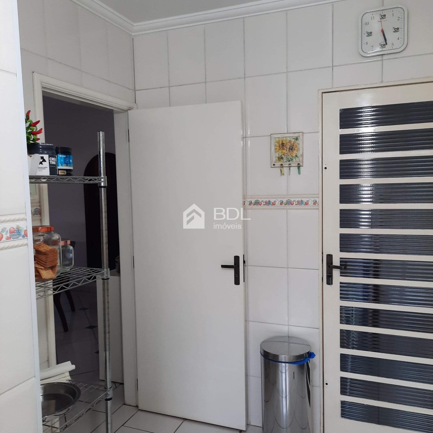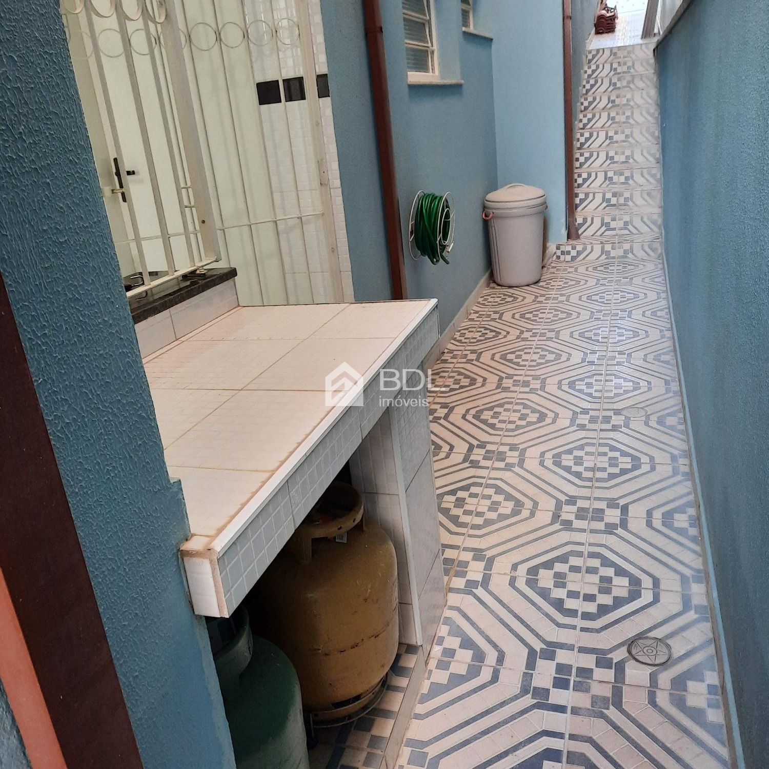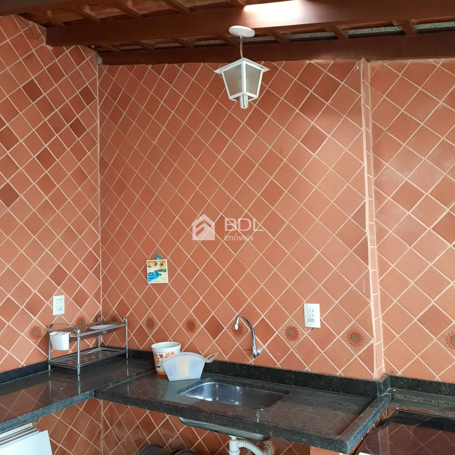 Espaço gourmet com churrasqueira e um quarto de despejo